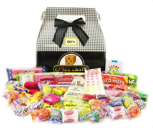 This Retro Candy Gift Boxes is full of favorite nostalgic candy assortments from past decades. GREAT FATHER'S DAY GIFT!1960's: Abba Zaba Minis, Big Hunk Minis, Boston Baked Beans, Chuckles, Candy Buttons, Candy Cigarettes, Charms Assorted Squares, Charms Sweet & Sour Pops, Cherry Heads, Cinnamon Toothpicks, Coconut Bar, Giant Smarties, Gold Mine Gum, Good & Plenty, Hot Tamales, Jujubes, Licorice Pipes, Red Hots, Sugar Daddy Pops, Sweetarts, Teaberry Gum, Wax Lips, Atomic Fireballs, Candy Necklace, Jawbreakers, Lemonheads, Necco Wafers, Now & Laters & Walnettos.Each box contains over 55 pieces (a mixture of small, medium & full size candies) & weighs between 2 - 2 1/2 pounds. Some items may be substituted if necessary. Box size approx. 9"x5"x10".